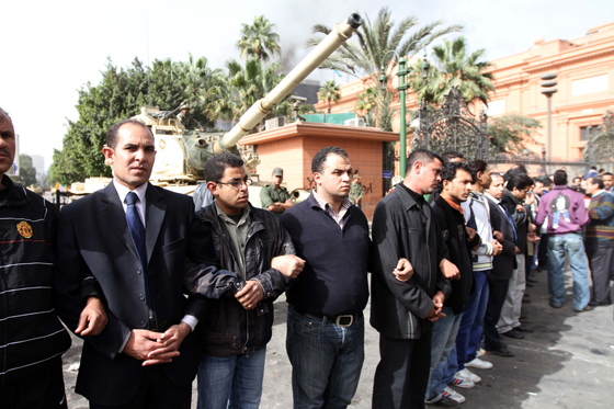 Живая стена активистов, защищающих музей Каира от разграбления© AFP / East NewsЗа время «арабской весны», начавшейся в 2010 году, из египетских музеев исчезло более двух тысяч древних экспонатов. Наибольший ущерб был нанесен Египетскому музею в Каире (как и НХМУ в Киеве, он оказался в самом центре столкновений — на площади Тахрир), когда в 2011 году массовые протесты привели к падению режима Мубарака. Тогда из фондов пропали десятки ценнейших памятников, многие были значительно повреждены. Гражданские активисты пытались защищать здание от мародеров, выстраивая живой щит, но избежать потерь все-таки не удалось: две статуи египетских фараонов были полностью уничтожены, редкая коллекция египетских древностей и собрание стеклянных ламп XI—XII веков подверглись частичному разрушению, десятки экспонатов были похищены, в том числе серия изделий из серебра. Полностью вернуть потери не удалось до сих пор. ЮНЕСКО выделила 100 тысяч долларов на реставрацию Египетского музея, но для полного восстановления нужны и частные средства. Ущерб понесли и другие сокровищницы: так, мародеры выкрали часть экспонатов римской и византийской эпох из хранилища древностей в Куантаре, совершили набег на Коптский музей, Королевский ювелирный музей и Национальный музей в Александрии. Серьезно пострадало здание Национальной библиотеки в Каире, где хранились книги и документы времен Древнего мира, Средневековья. Летом 2013 года из Национального музея Малави в городе Эль-Минья пропало более 500 предметов искусства древности. Поиски ведутся по сей день.