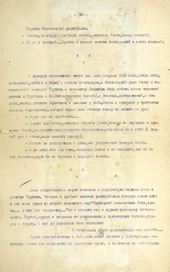 28 ноября 202466956Недавно в серии «Литературные памятники» (М.: Ладомир; Наука, 2015) вышло подготовленное мною издание романа М.А. Булгакова «Белая гвардия». В сопроводительной статье «Путь Турбиных» затрагивается любопытный сюжет четвертьвековой давности. В начале1991 г. (прямо накануне 100-летнего юбилея Булгакова) некий коллекционер Владимиров обрел машинописи финальных фрагментов «Белой гвардии»: «…в феврале 1991 года одна из машинописных копий с авторской правкой… заключительной главы была приобретена нами в московском букинистическом магазине вместе с пачкой старых дореволюционных газет» (Владимиров И. Алый мах всадника из Апокалипсиса // Булгаков М.А. Белая гвардия. — М., 1998. С. 269). До этого сообщалось о «двух машинописных редакциях окончания романа, одна из них с авторской правкой» (Владимиров И. К истории романа // Слово. 1992. № 7. С. 71). Ту машинопись, которая «без правки», Владимиров впоследствии передаст в Фонд культуры, откуда она попадет в Российскую государственную библиотеку (см. ниже), а ту, что «с правкой», оставит у себя. О ней-то главным образом и речь.
