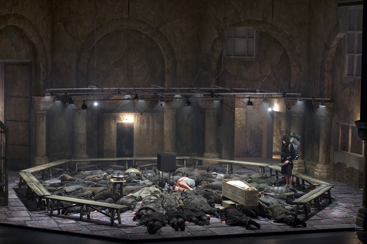 Действие первого и третьего актов «Парсифаля» разворачивается в интерьерах заброшенного полуразрушенного храма — пространства, лишившегося изначального смысла, утратившего свое содержание. Эта заложенная в сценографии идея пластически экспонируется в первой же мизансцене спектакля, когда шестеро молодых служек по указанию Гурнеманца ложатся на пол, держась за руки и образуя таким образом ритуальный круг. Участники странного обряда переглядываются между собой: его логика давно утрачена, осталась только механически соблюдаемая выхолощенная схема.