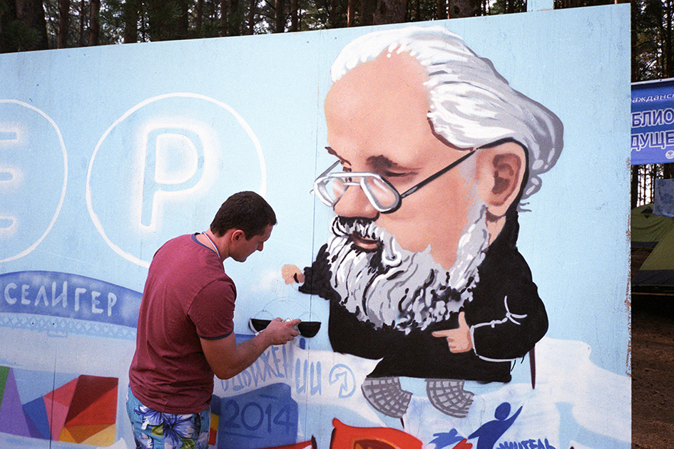 В этом году форуму десять лет. Бывалые кривят лица — стало меньше политики, больше религиозных разговоров и меньше движухи. Говорят о свободе: «Раньше как было? Вот приезжает Путин — на бельевых веревках плавки сохнуть не должны, он не должен знать, что ты купаешься». Я отмечаю, что бутафории почти нет — даже портреты президента только на растяжках с цитатами между скрипучих сосен. Такие же есть у Ницше, Достоевского, Королева, далай-ламы и других. Путин теряется. На вечернем построении с главной сцены транслируется видео во славу Родины — в видеоряде последовательно сменяют друг друга автомат Калашникова, суровый медведь в яростном броске, купола церкви, парящий белый голубь и лучезарный Гагарин, Николай II и портрет Сталина. Затем — гимн России, во время исполнения которого все образуют раскачивающиеся из стороны в сторону шеренги. Все это уже не укладывается в моей голове.