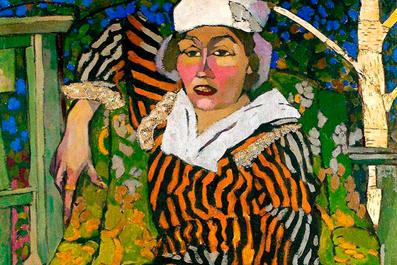 Аристарх Лентулов. Женщина в полосатом платье. Портрет М.П. Лентуловой на фоне березы. 1915 (фрагмент)